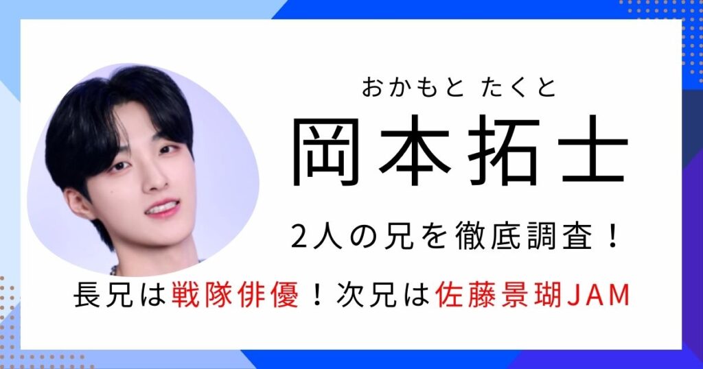 「PRODUCE 101 JAPAN 新世界」(通称:日プ新世界)の参加者・岡本拓士(おかもと たくと)さんには、兄が2人いるんだとか。 ネット上では「俳優の葉山侑樹さんの弟だ」「佐藤景瑚JAMの子の弟」など、兄弟がいることをウワサされていました。 岡本拓士さん... -