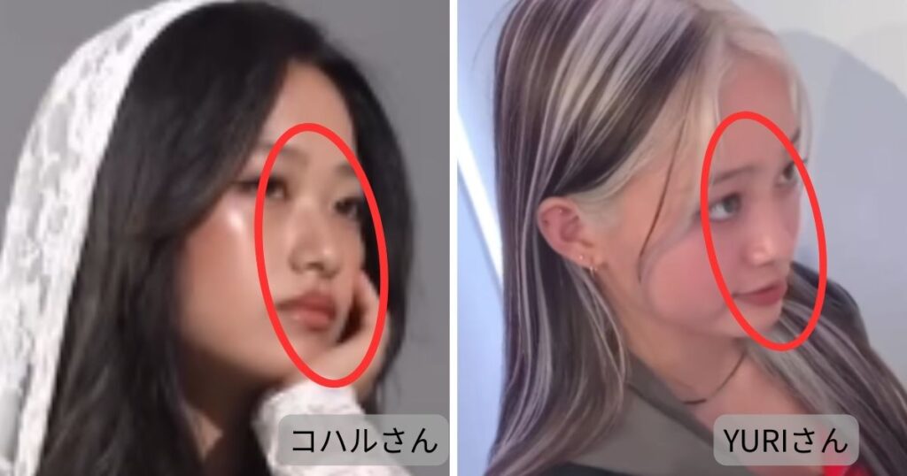 コハルさんとYURIさんの鼻の高さを比べるために、少し違う角度から見てみましょう。