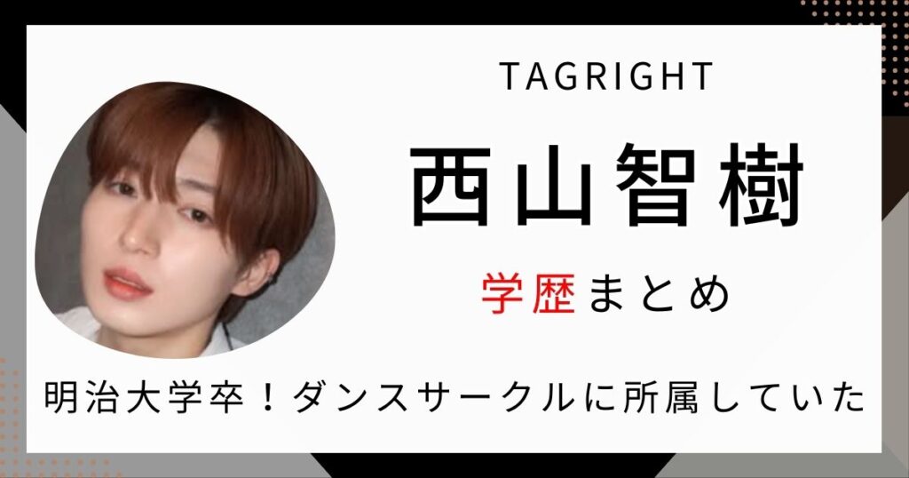 ボーイズグループ「TAGRIGHT」(タグライト)のメンバー・西山智樹(にしやま ともき)さん。 明治大学を卒業した高学歴のブレインメンバーです。 そんな西山智樹さんについて、出身高校や学歴が気になる人も多いのではないでしょうか。 今回は、「TAGRIGH... -